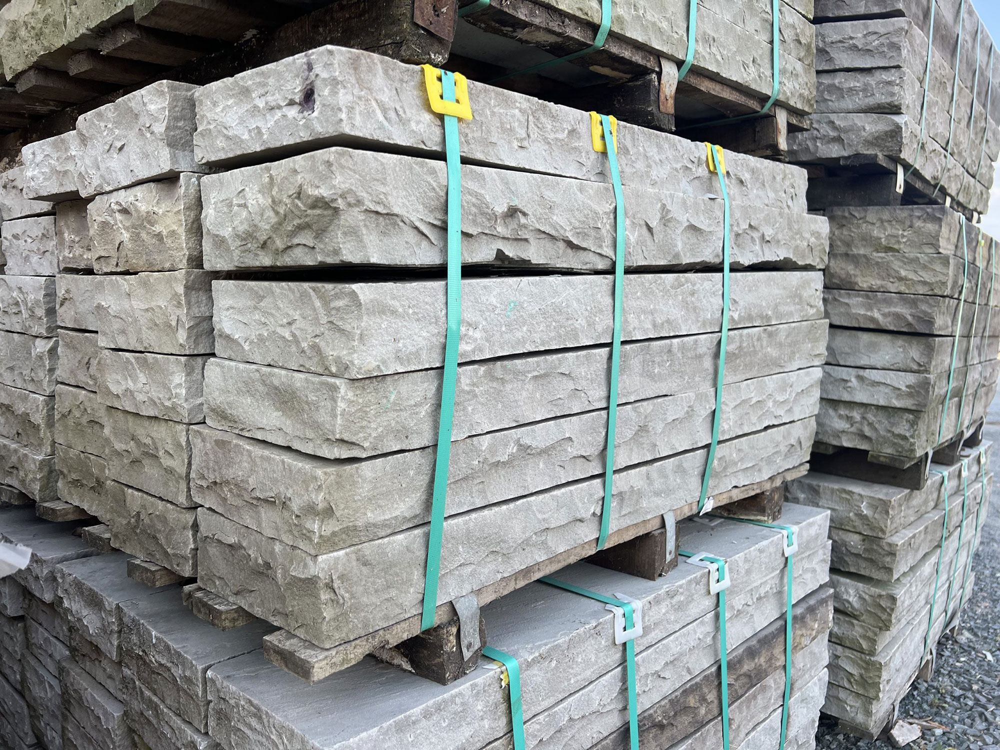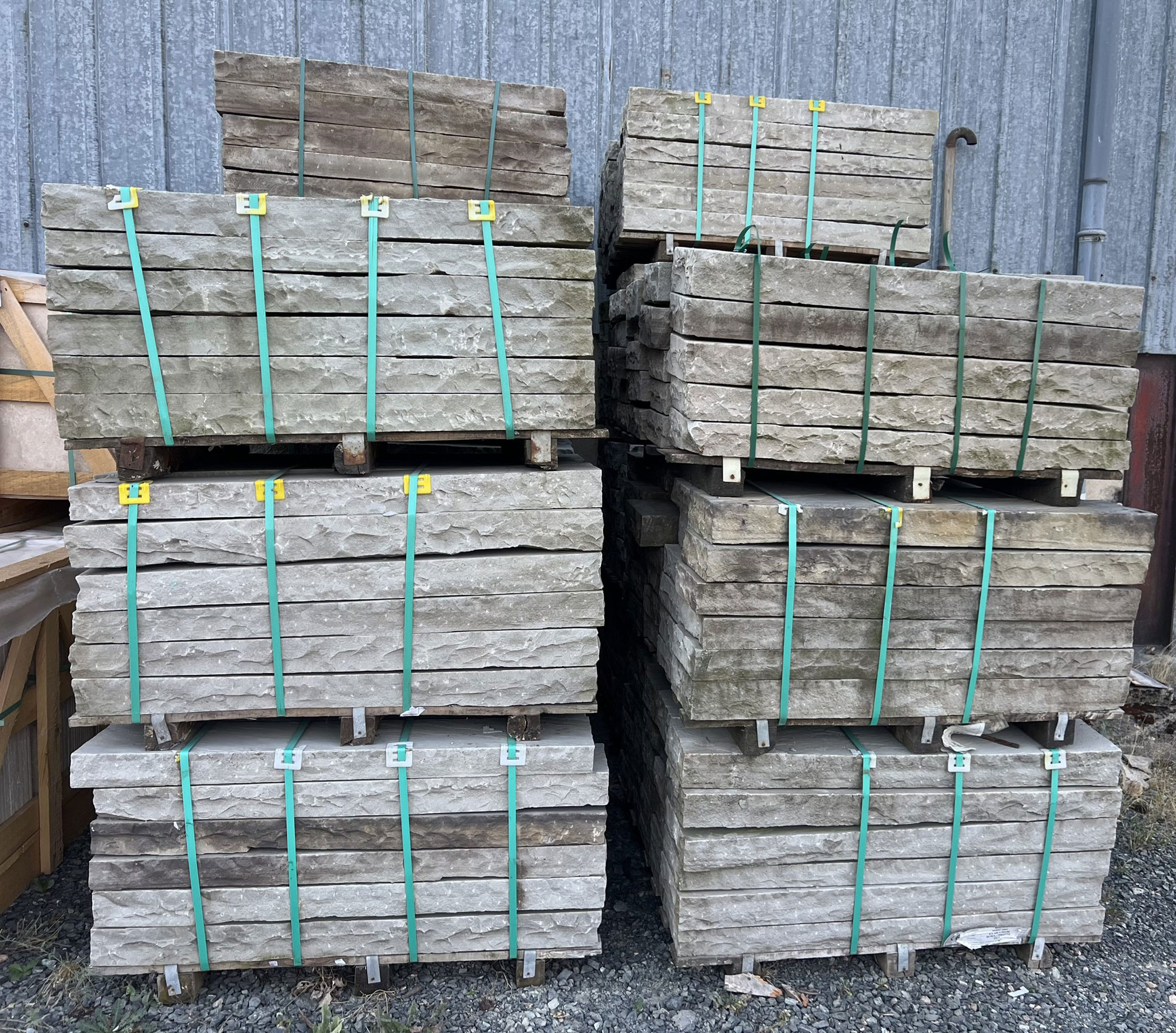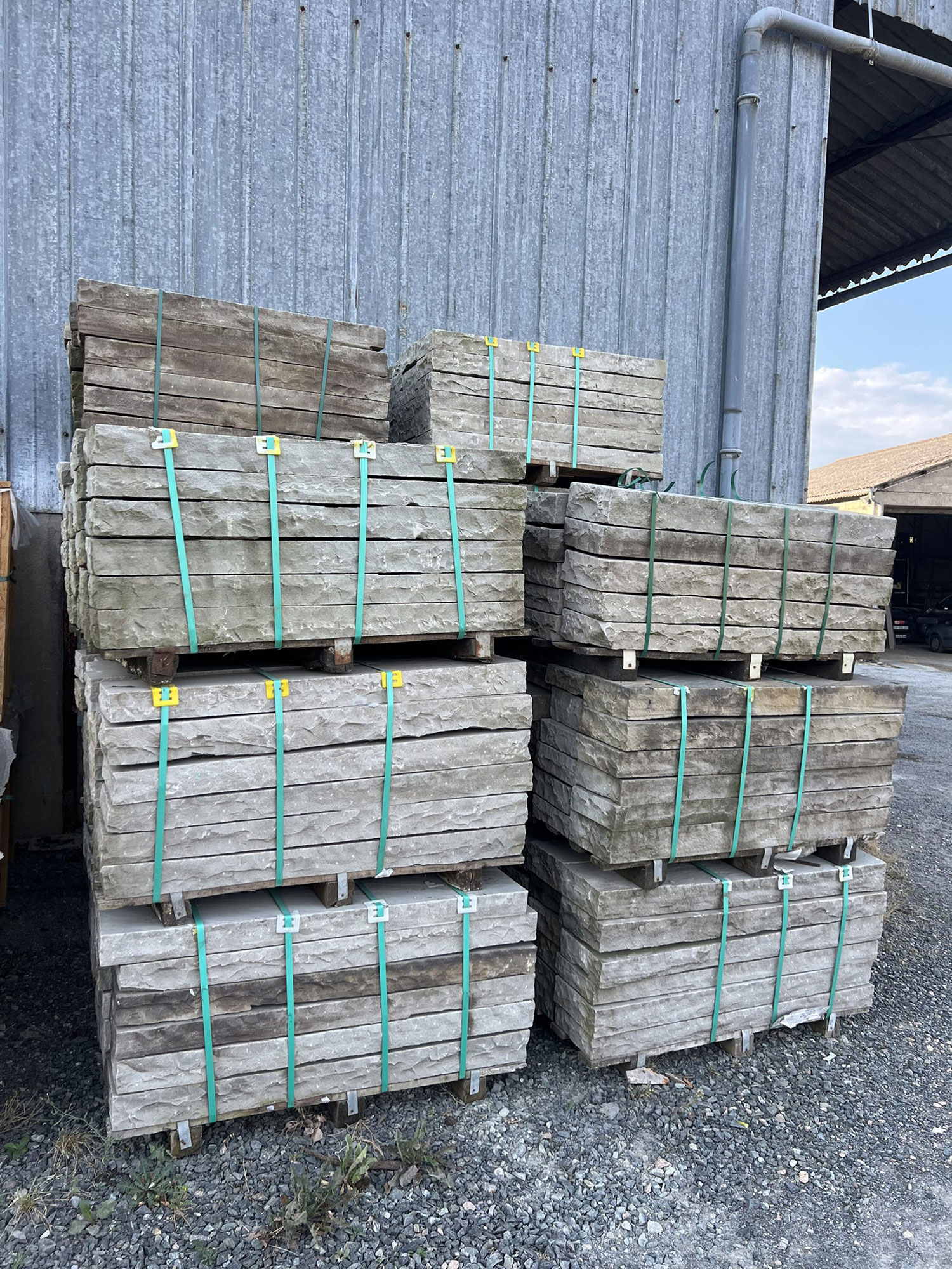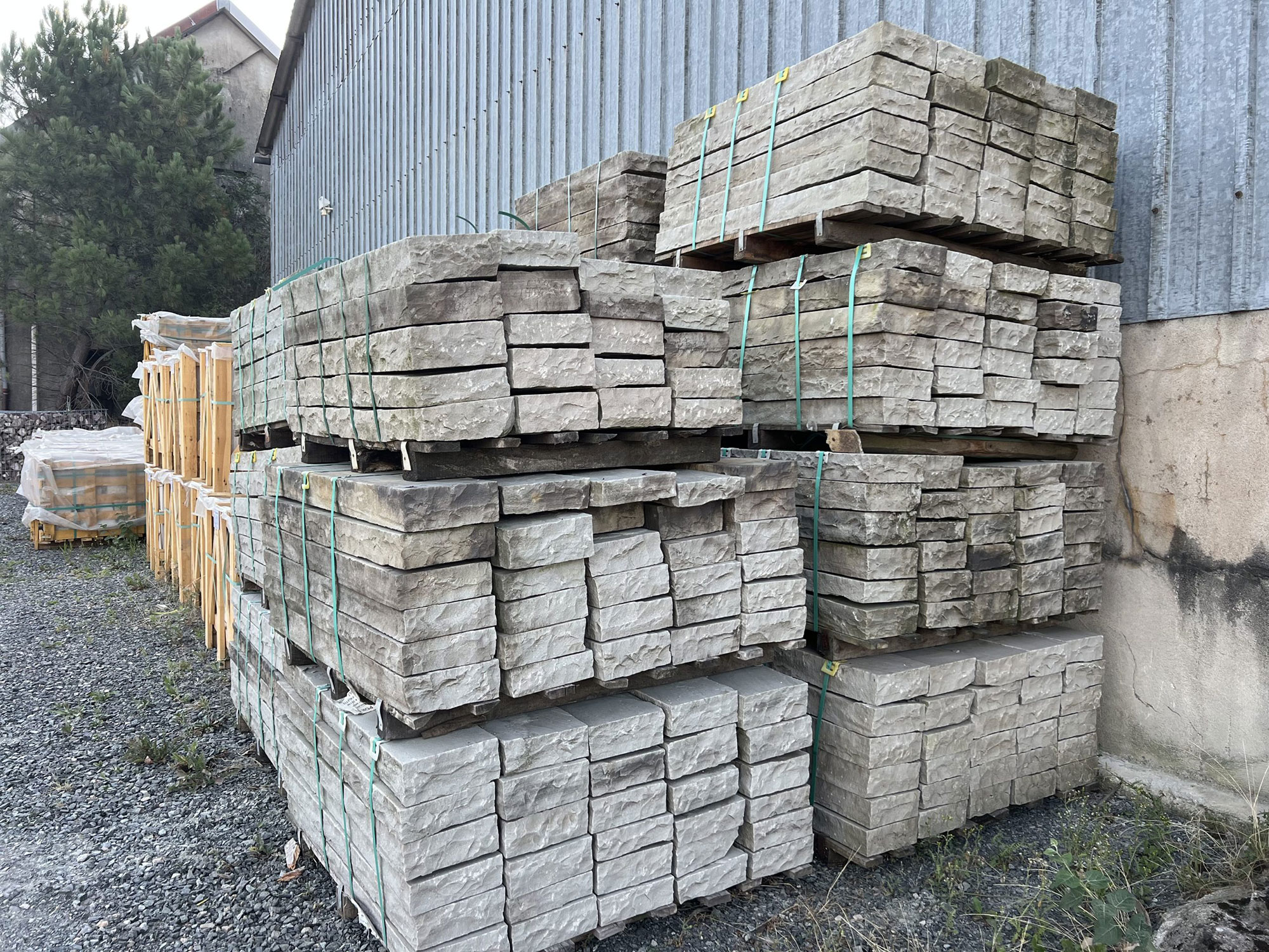 Bordures en grès gris. Finition naturelle/éclatée sur les 6 face. Présence de trace noires et vertes du à un long stockage en extérieur. S’enlève facilement après lavage avec un produit nettoyant.