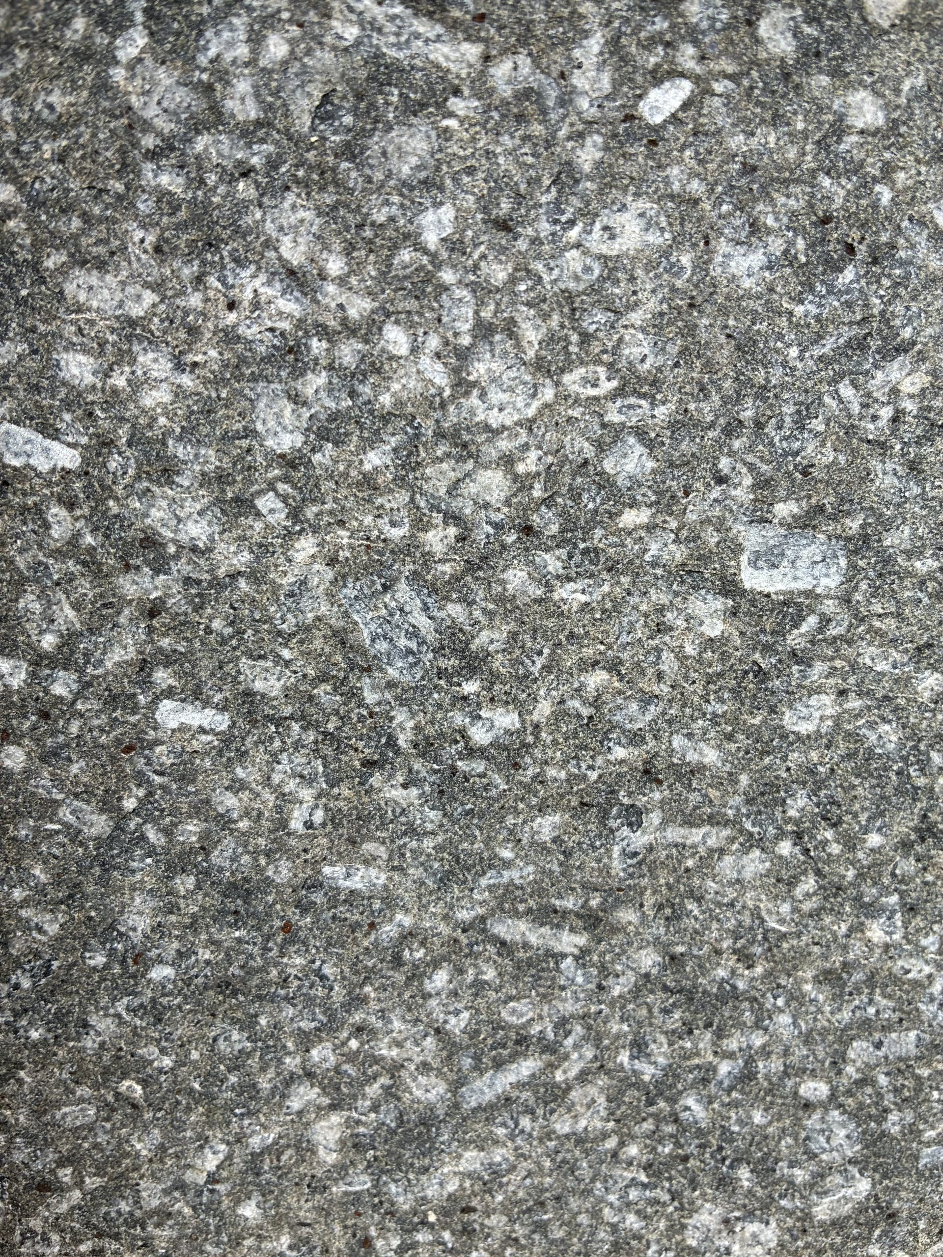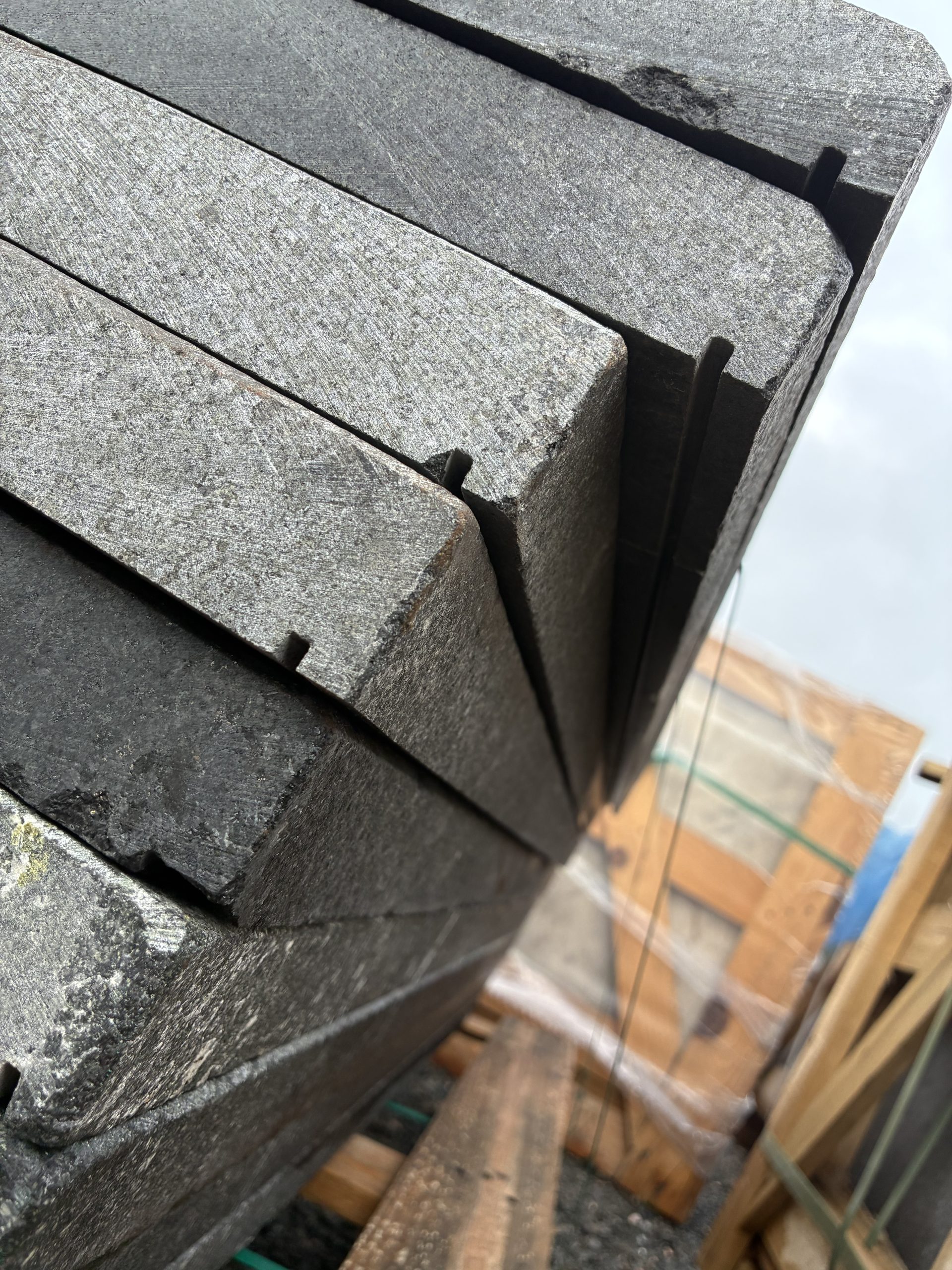 Couvertine en granit gris anthracite. Finition flammée. Bord chanfreiné + goutte d’eau sur 2 grands côtés.