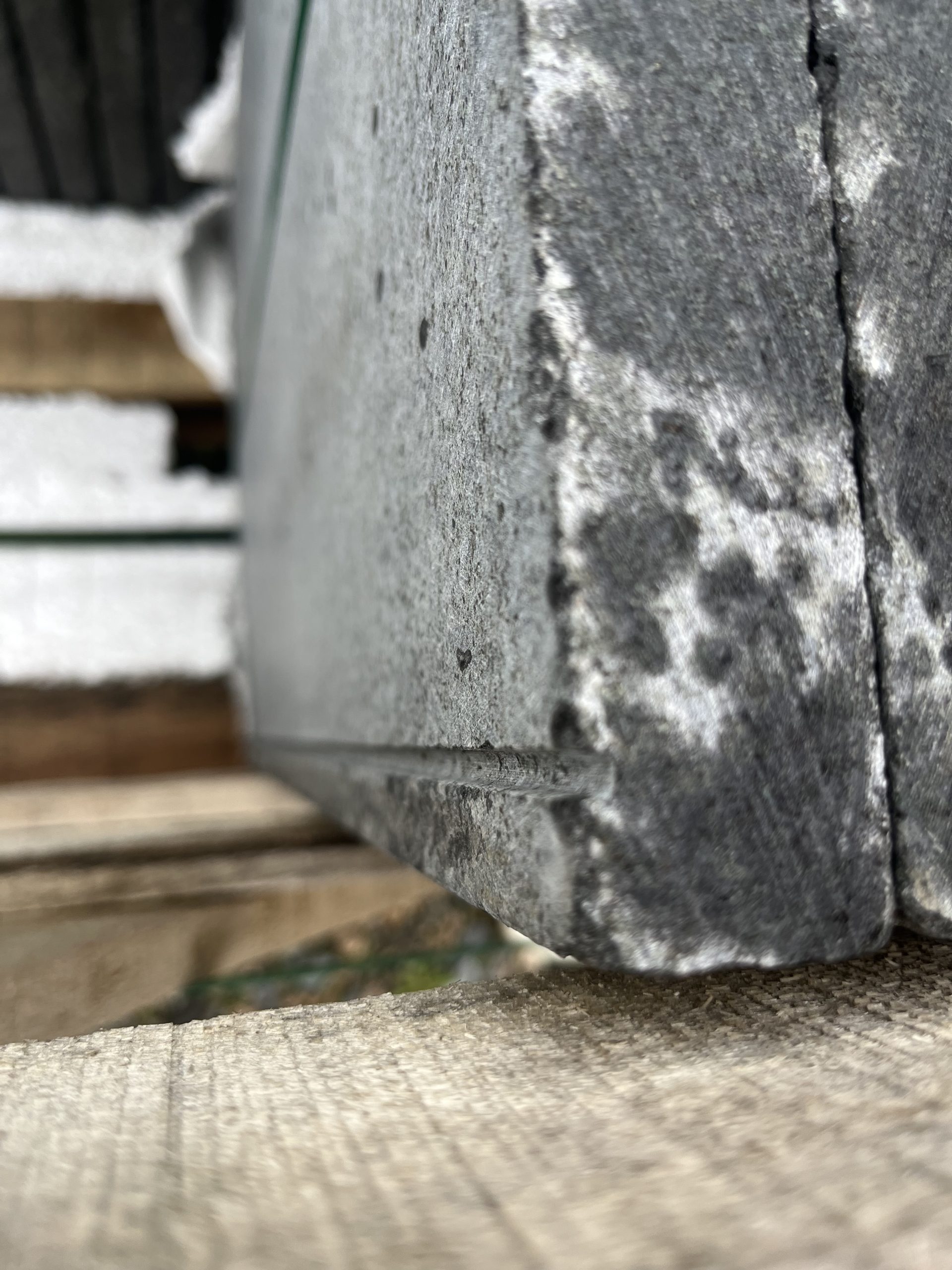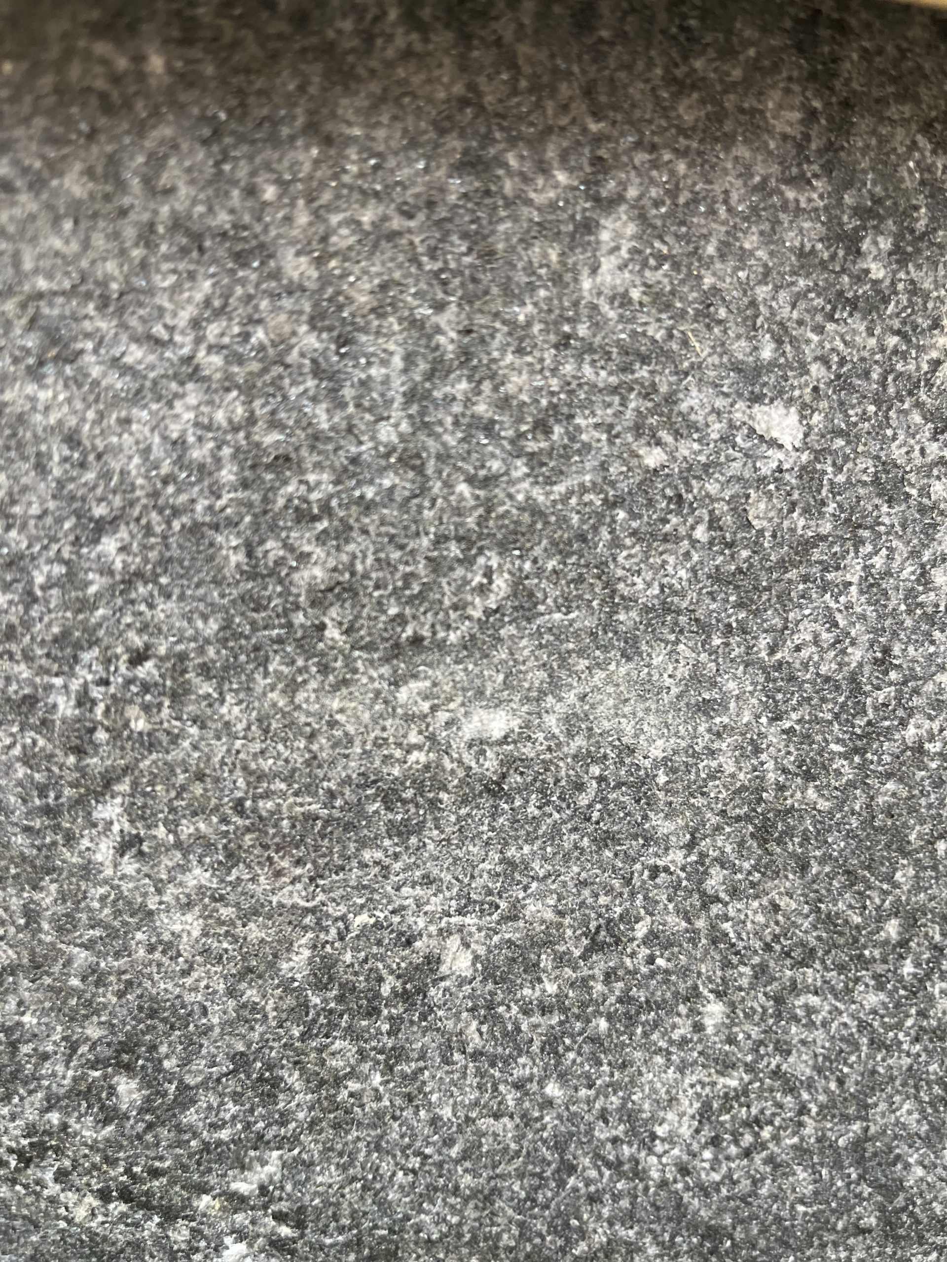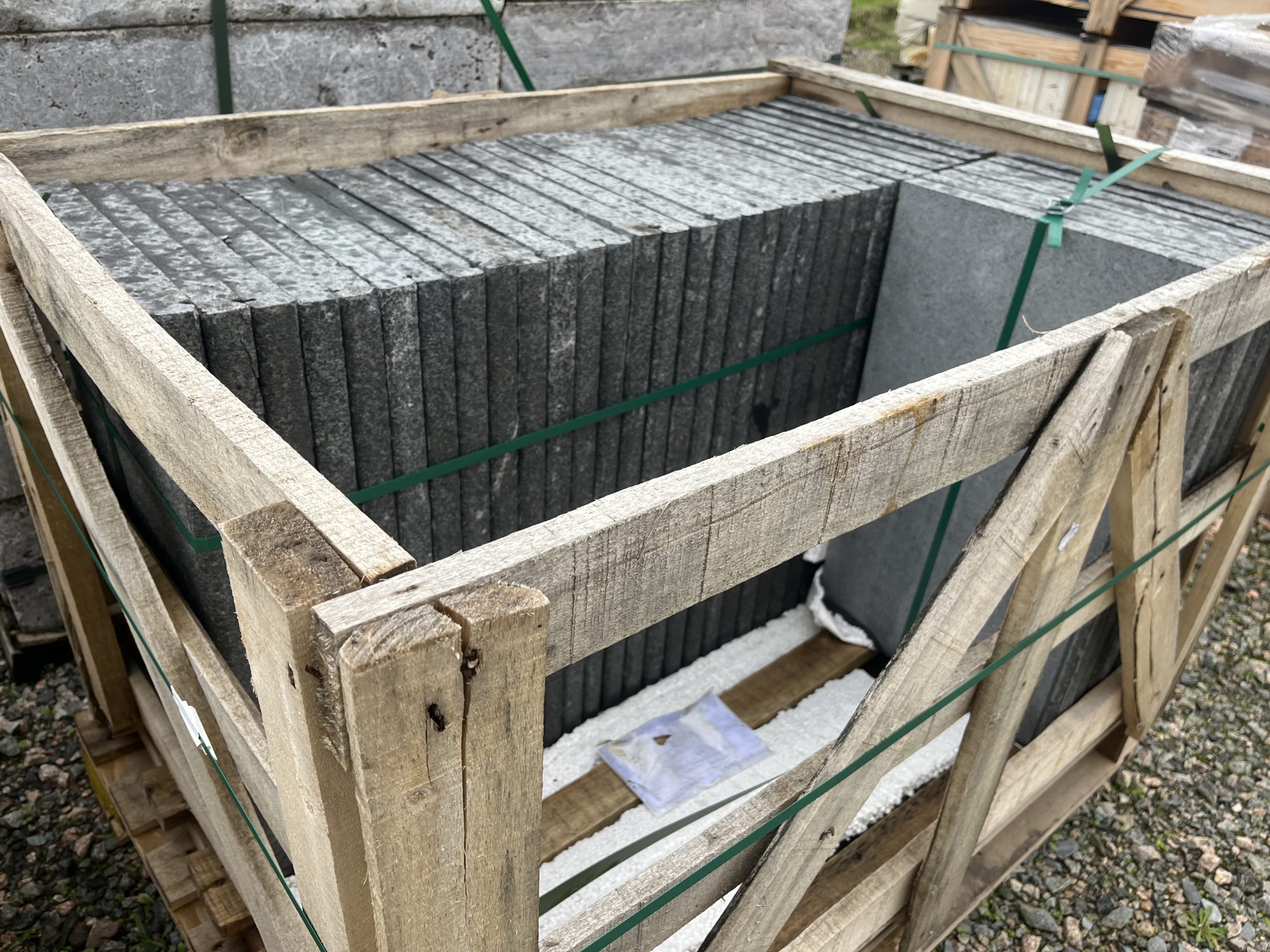 Margelle en granit gris anthracite avec bord 1/2 rond. Finition flammée + goutte d’eau sur un grand côté.
